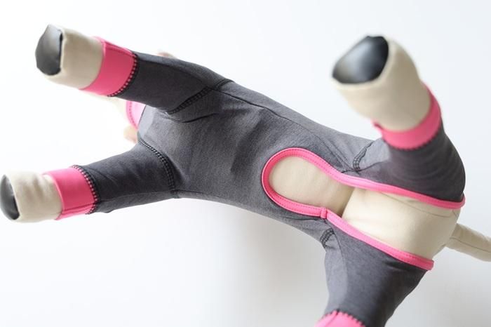 ※お座りした時に後ろ足の膝の部分が外側にずれて脱げてしまう場合があります。
